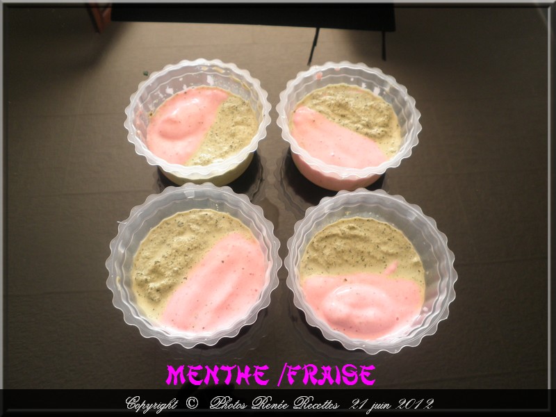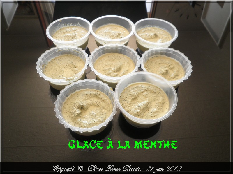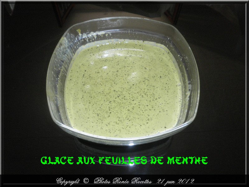 versez votre préparation dans une boite à glace ou autre récipient puis mettez au congèle.lorsque la glace est bien prise,la sortir et laisser un peu décongeler de façon à pouvoir la remettre dans le mixer.mixer un peu et servir dans de jolies petites coupelles sans oublier de mettre une feuille de menthe sur le milieu pour faire **joli*
